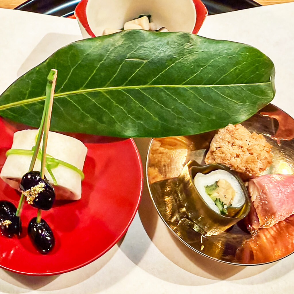 【前菜】法蓮草ときのこの胡麻和え さごし小袖寿司 平目龍皮巻 助子生姜煮 黒豆松葉 合鴨ロース香草蒸し