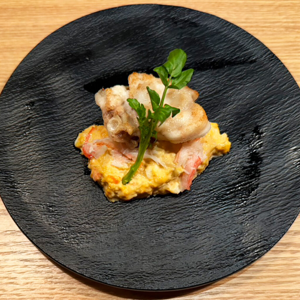 【先付】ズワイガニ甲羅盛り 河豚の煮凝り掛け 彩野菜