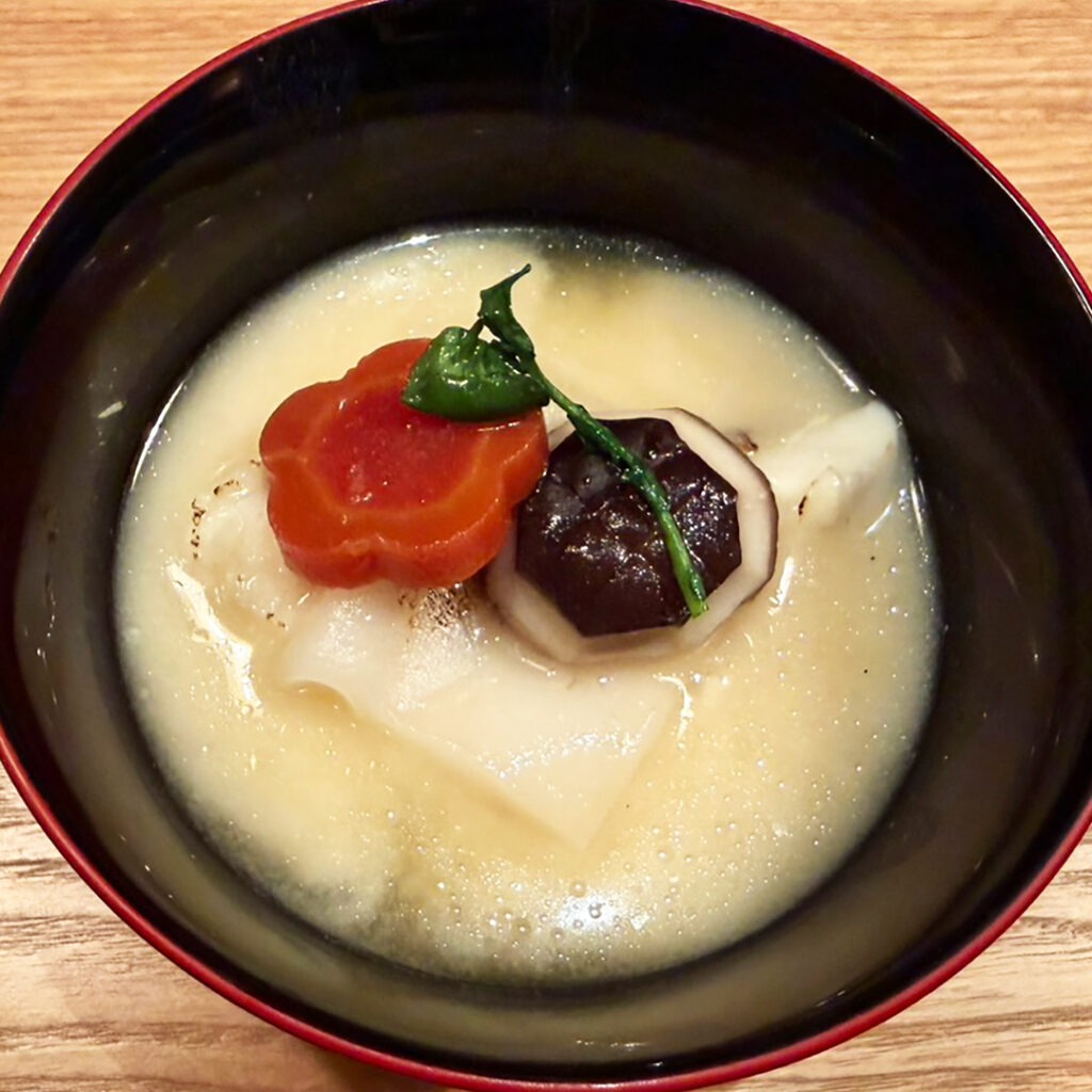 【椀物】雑煮白味噌仕立て 焼鯛 梅人参 しゃぶ餅 椎茸